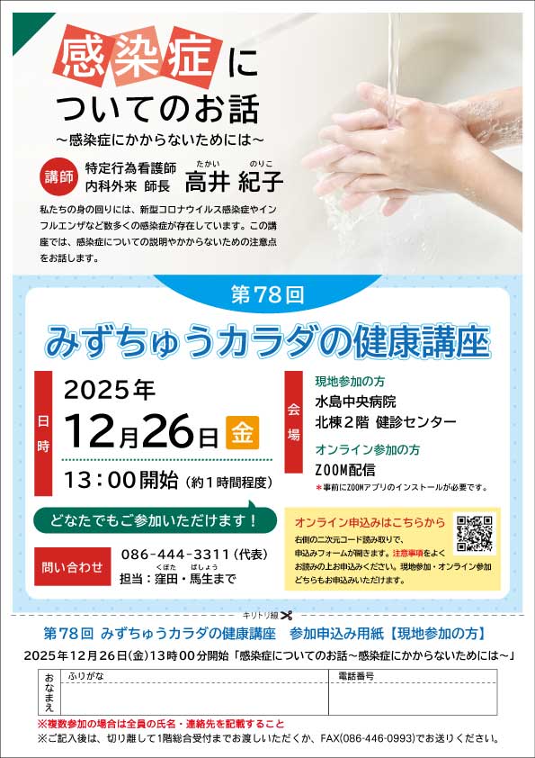 | 会場 | 現地参加の方:水島中央病院北棟2階 健診センター オンライン参加の方:ZOOM配信にて |