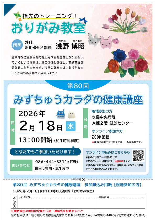 | 会場 | 現地参加の方:水島中央病院A棟2階 健診センター オンライン参加の方:ZOOM配信にて |